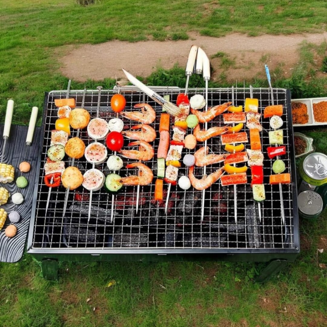 For more intimate gatherings or solo adventures, the small BBQ folding grill is the ideal choice. Folded, it measures 14 inches in length, 11 inches in width, and 2.5 inches in height. When unfolded, it offers a grilling surface of 14 inches in length, 11 inches in width, and 8 inches in height. Despite its compact size, this grill doesn’t compromise on performance. It’s perfect for grilling meats, vegetables, and even small cuts of fish with ease.